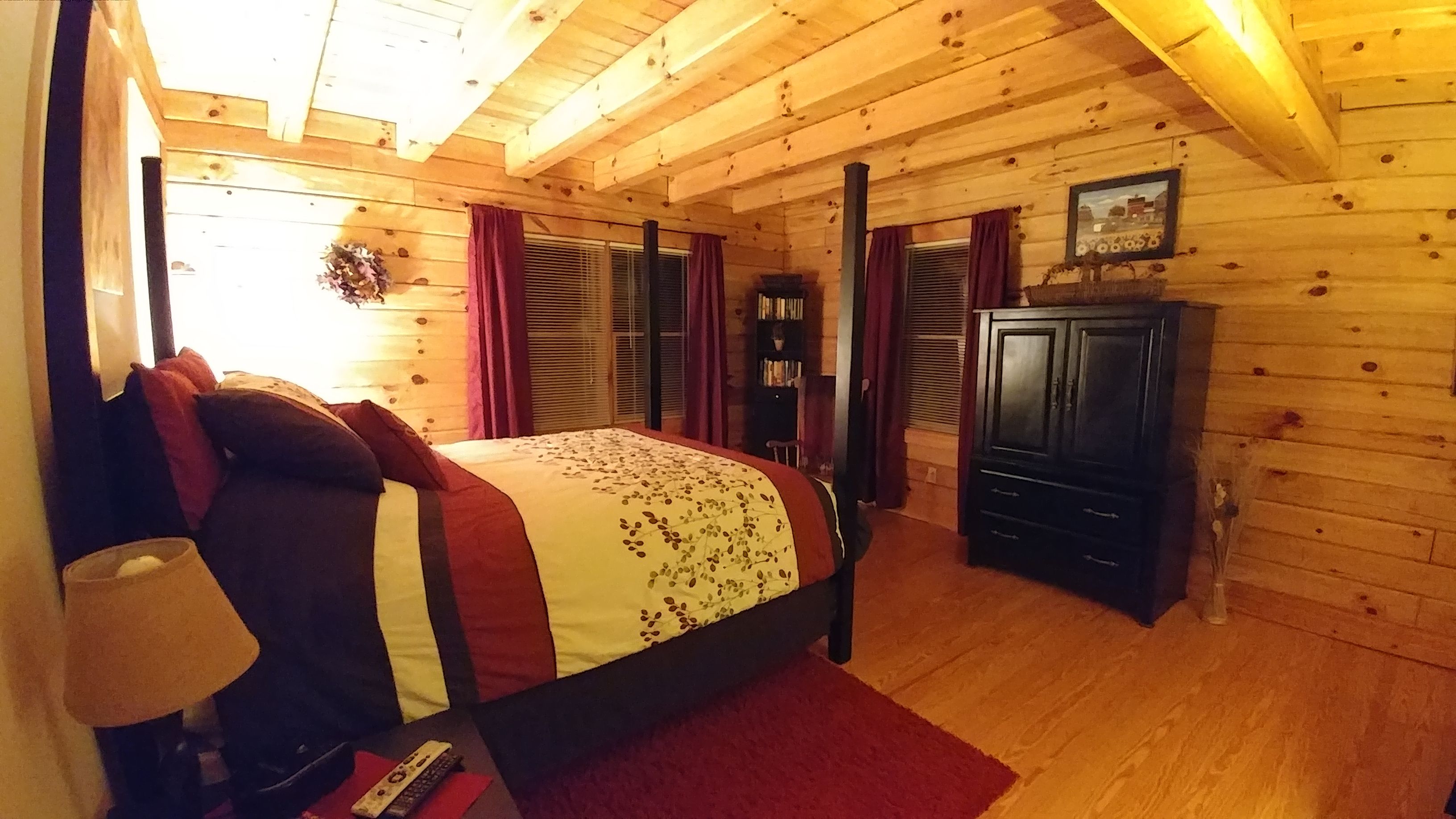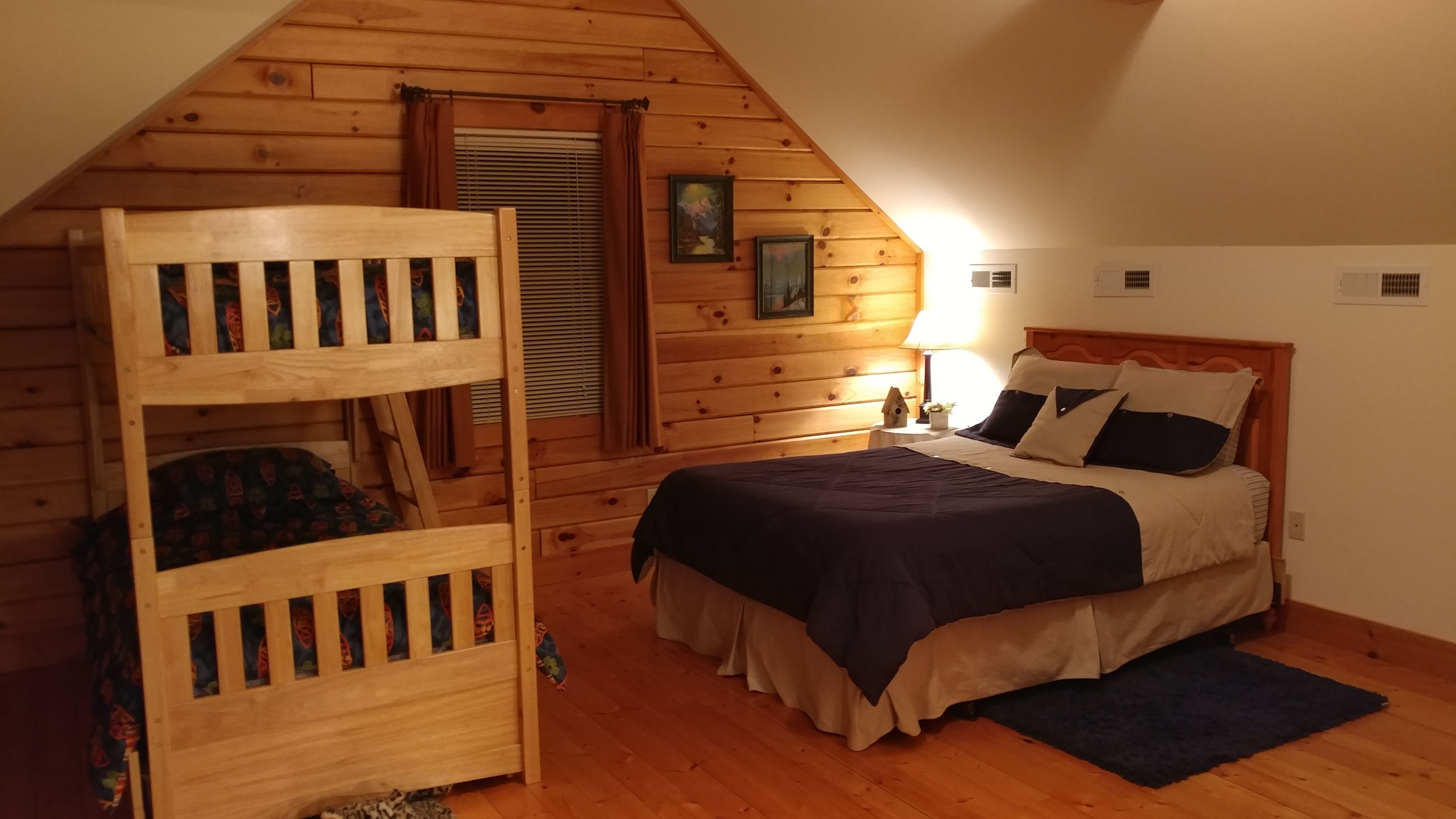 - Loft bedroom with queen bed, futon, bunkbeds, and bathroom with shower